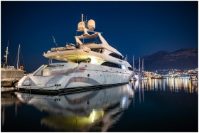 Elegant yacht reflecting in calm marina waters under a starry night sky.