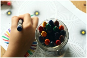 A child drawing with colorful crayons, fostering creativity and fun in a learning environment.