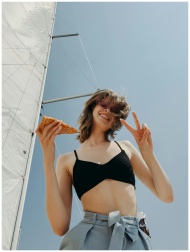 Smiling woman on a yacht under a sail, holding pizza and making a peace sign.