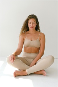 Full body of fit barefoot female with long hair wearing beige activewear looking at camera while sitting in lotus posture against white background