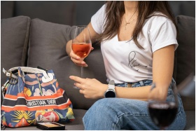 Woman in white shirt and jeans holding a wine glass on a cozy couch with a designer bag beside her.