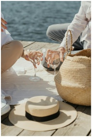 Couple enjoying a romantic picnic with wineglasses on a pier by the water.