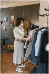 Woman browsing clothing in a store while wearing a face mask for protection.