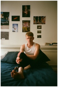 A young man in a tank top sits on a bed in a creatively decorated room.