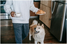 Crop faceless young male owner in casual clothes walking in kitchen near curious Akita Inu dog with coffee cup and plate with croissant in hands