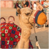 Close-up of a camel with colorful decorations in t