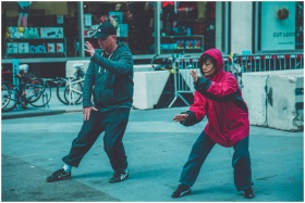 Two adults practicing martial arts on the street,