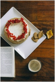 Delicious cake topped with lingonberries beside an open book and coffee on a wooden table.