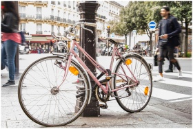 Pink bicycle locked to a post on a bustling Paris street with pedestrians in motion.
