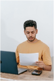Serious young bearded Hispanic businessman in casual outfit reading contract while sitting at table with laptop in office
