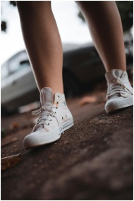 Stylish white sneakers on an outdoor city sidewalk, showcasing casual urban footwear fashion.