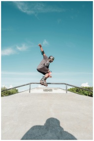 A skater skillfully grinding a rail at an outdoor