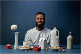 Smiling man enjoying a nutritious almond milk brea