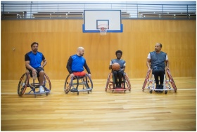 Four men in wheelchairs on a basketball court prep