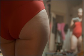 A close-up view of a person embracing body positivity in red swimwear, self-reflecting in a mirror.