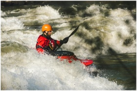 Man kayaking through whitewater rapids, showcasing