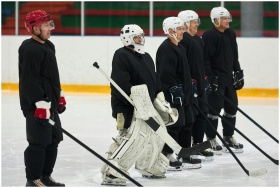 A team of adult male hockey players in uniforms st