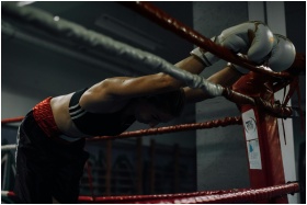 A dedicated female boxer rests in the ring, showcasing strength and perseverance.