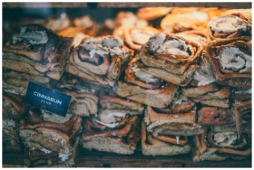 Through glass of sweet delicious buns with sugar powder and cream placed on counter in shop