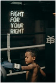 Focused young boy throws a punch in a dimly lit boxing gym with motivational text.