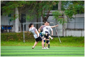 Women's football players in action during an outdoor match in Hanoi, Vietnam.