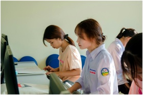 Three young women concentrating on a computer task in a classroom setting.