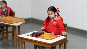A young girl in a classroom focused on a Montessori educational activity with colorful blocks.