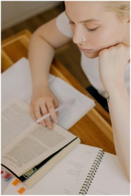 Focused young woman in casual attire studying with