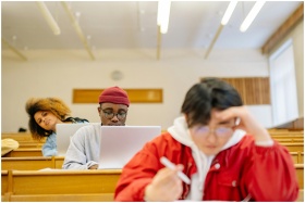 Diverse group of college students focused on studying in a university classroom setting.