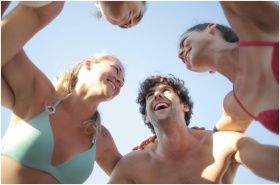 Group of happy friends laughing in swimwear under