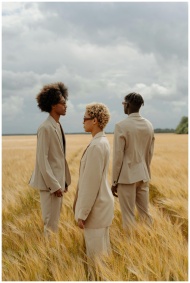 Three fashionable individuals in beige suits standing in a wheat field under a cloudy sky.