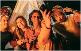 A joyful group of friends takes a selfie around a tent, sharing laughter and warmth at a nighttime gathering.