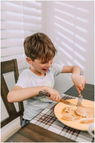 A happy child enjoying pancakes at a dining table during breakfast at home.