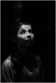 Artistic black and white photograph of a woman gazing upwards, dramatic lighting.