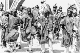 Group of African men in traditional attire performing with drums during a cultural festival.