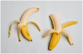 Two peeled bananas on a light background, showcasing freshness and simplicity.
