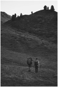 Two hikers traverse a serene mountain path in Cesana Torinese, captured in grayscale.