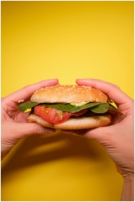 Crop faceless person hands with burger with tomatoes and green leaves with meat cutlet on yellow background in bright studio