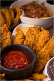 Close-up of crispy fried chicken served with ketchup and mustard sauce.