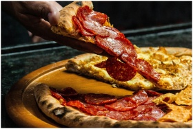 Fresh pepperoni pizza slice being lifted from a wooden board by hand. Tasty and mouth-watering dinner option.