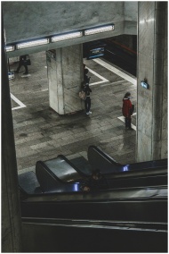 High-angle view of people on escalators in a subwa
