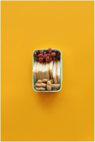 Top view of a lunch box with grapes, sandwich, and peanuts on yellow background.
