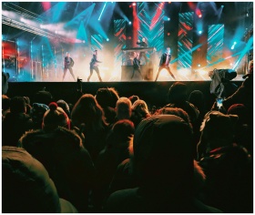 Energetic concert crowd enjoying a nighttime performance in Helsinki with vibrant lights and performers.