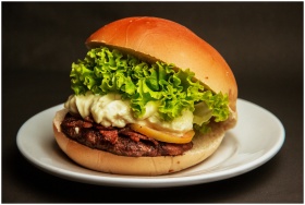 Close-up of a gourmet cheeseburger with fresh lettuce, mayonnaise, and beef patty on a white plate.