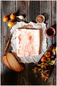 Top view of salo, vegetables, and bread on a rustic wooden table setting.