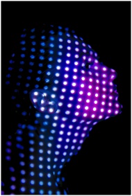 Artistic side profile portrait of a woman with vibrant purple and blue dot light projections on her face.