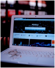Laptop on a desk showing the Pexels homepage, high