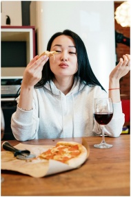 Woman savoring a pizza slice with a glass of wine