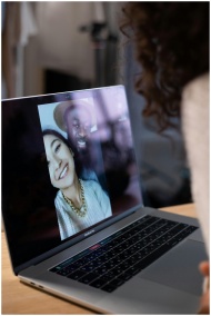 Friends enjoying a virtual connection via video call from home on a laptop.