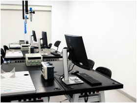 A contemporary electronics lab featuring computers